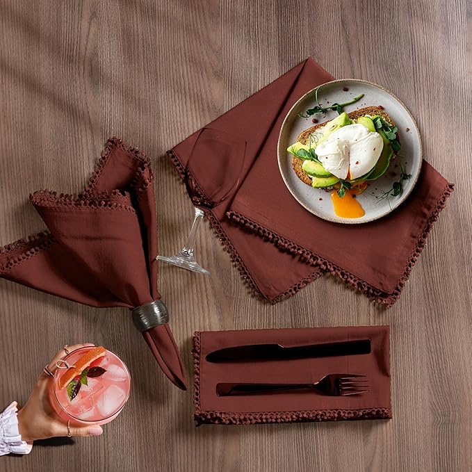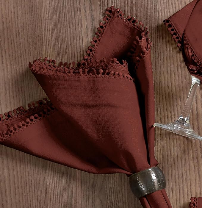 Bedding Craft Cotton Cloth Dinner Napkins Set of 12 – 18x18 Chili Oil with Decorative Lace Selvedge – Reusable Machine Washable Fabric Napkins for Weddings, Baby Showers, Parties & Table Décor
