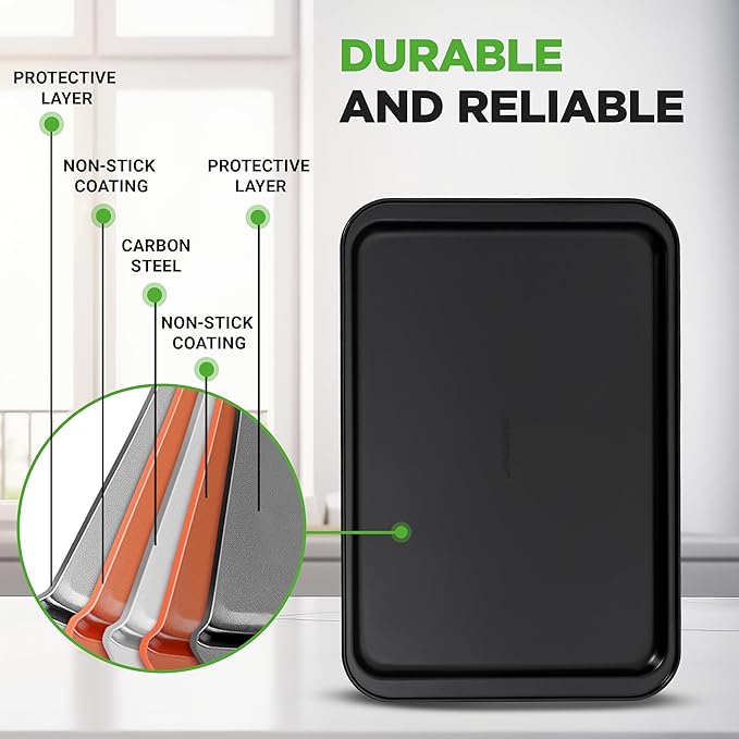 - HEAT-RESISTANT AND DURABLE DESIGN – Built to withstand temperatures up to 446°F, this bakeware ensures safe, even cooking. Reinforced grips provide a secure hold and the carbon steel design prevents warping over time.