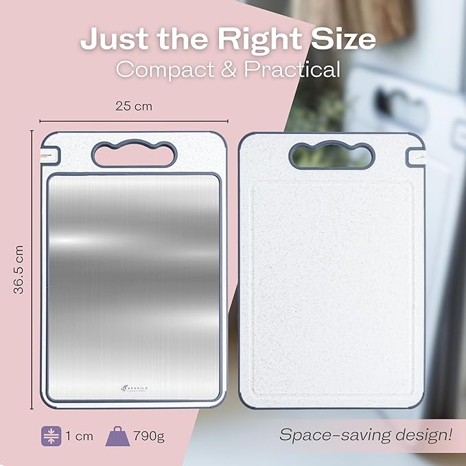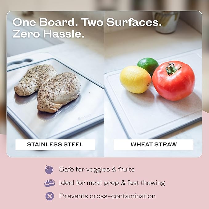 - Non-Toxic, Worry-Free Prep – Two sides made with 304 stainless steel and BPA-free wheat straw, this board keeps harmful microplastics and toxins out of your food. Unlike plastic boards that can shed particles or wood that absorbs odors, it’s a safer, eco-friendly choice for you and your family.