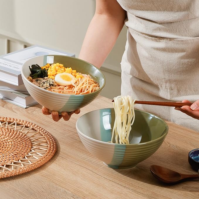 NUTRIUPS Set of 2 Ceramic Ramen Bowls with Spoons & Chopsticks, 40oz Large Soup Bowls for Udon, Miso, Noodles (Tri-Color Modern)