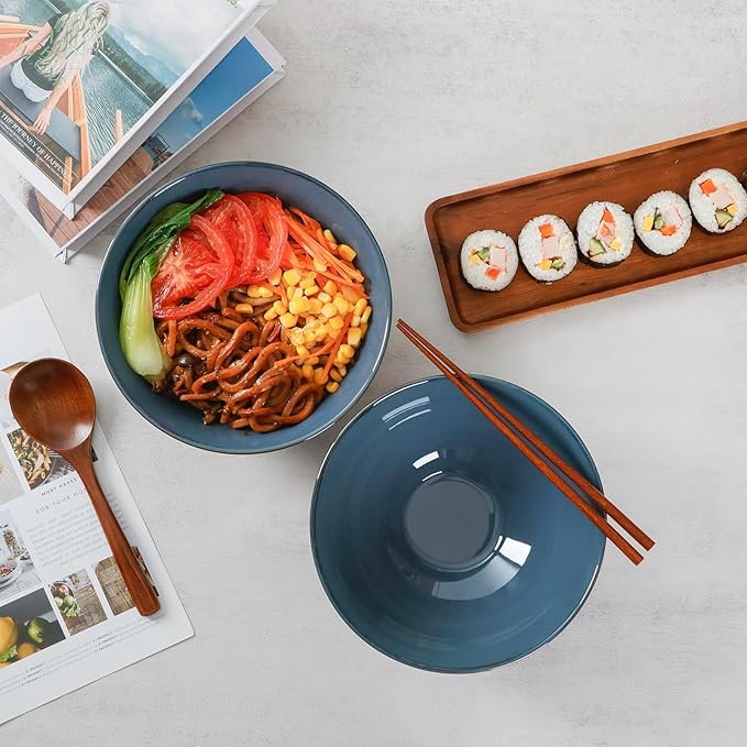 NUTRIUPS Set of 2 Ceramic Ramen Bowls with Spoons & Chopsticks, 40oz Large Soup Bowls for Udon, Miso, Noodles (Ocean & Earth)
