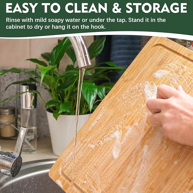- 【Carbonized Bamboo Construction】This bamboo cutting boards for kitchen undergoes high-temperature carbonization for enhanced density and moisture resistance. This meets FDA standards while being eco-friendly. With significantly fewer pores than traditional wooden cutting board options, these non toxic cutting boards enable thorough cleaning and prevent odor transfer, ensuring safer food preparation for health-conscious households