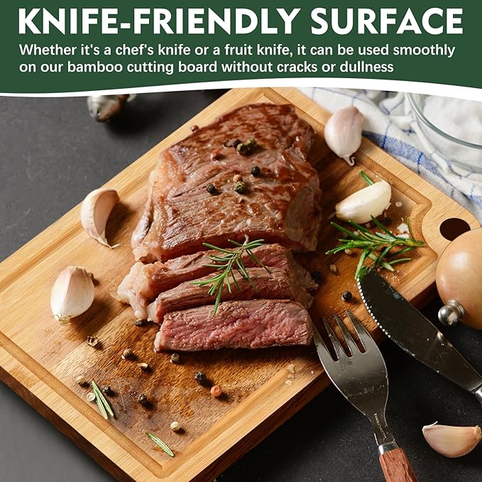 - 【Knife-Friendly Protective Surface】The bamboo cutting board features a resilient surface that protects knife edges from premature dulling. Both professional chef knives and delicate paring knives maintain optimal performance on these wooden cutting board, reducing frequent sharpening needs. Excellent for housewarmings, holidays, or as an the chopping board solution for compact kitchens