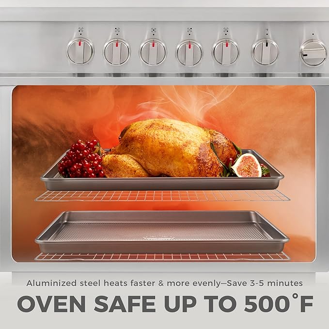 - HEAVY-DUTY & WARP-RESISTANT: Crafted from 0.8mm heavy-duty aluminized steel, these nonstick cookie sheets offer outstanding strength and durability. Reinforced rims prevent warping at high heat—oven-safe up to 500°F and built for everyday use.
