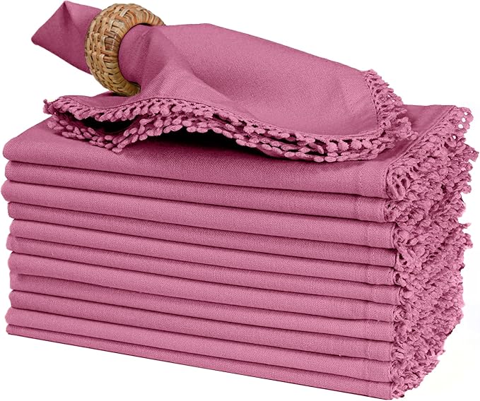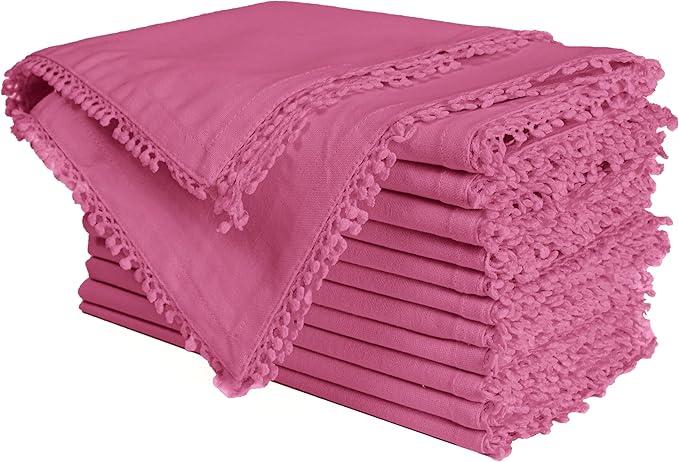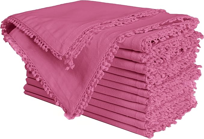 Bedding Craft Cotton Cloth Dinner Napkins Set of 12 – 18x18 Wild Orchid Pink with Decorative Lace Selvedge – Elegant Machine Washable Fabric Napkins for Weddings, Parties, Baby Showers & Table Décor