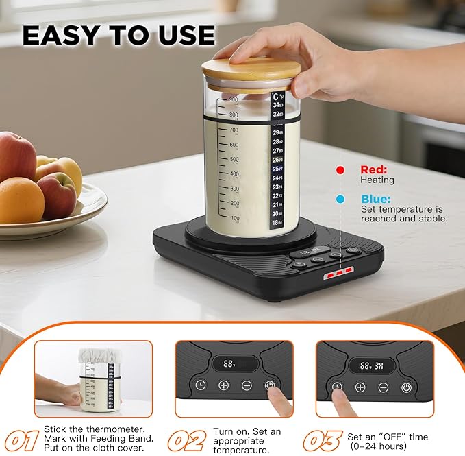 Sourdough Starter Warmer Kit with 34oz Glass Jar & Thermometer - 24H Timer Auto ON/OFF, 1°F Control (70-100°F), Smart Warming Memory, Sour Dough Bread Starter Heater Accessories, Home Baker Tool Gifts