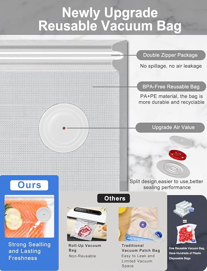- 【Reusable & Easy to Clean】The vacuum bags come with upgraded sealing air pressure valve and thickened double sealing zipper, larger capacity and better vacuum performance. The reusable sous vide bags are made of food grade PA+PE material, BPA-free, more durable and easy to clean.