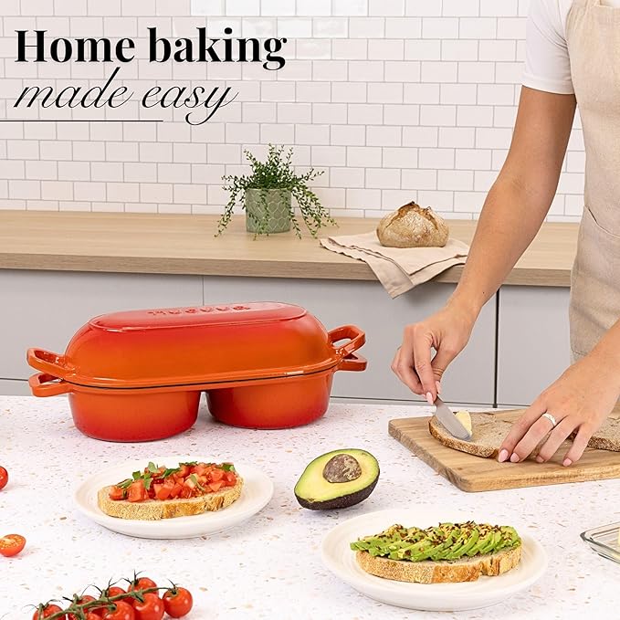 Dutch Oven For Sourdough Bread Baking – Enamelled Cast Iron Bread Loaf Pot – 500°F Oven Safe Non Stick Bread Pot – Double Round Loaf Space, 16.5cm Diameter, Orange, – by Nuovva