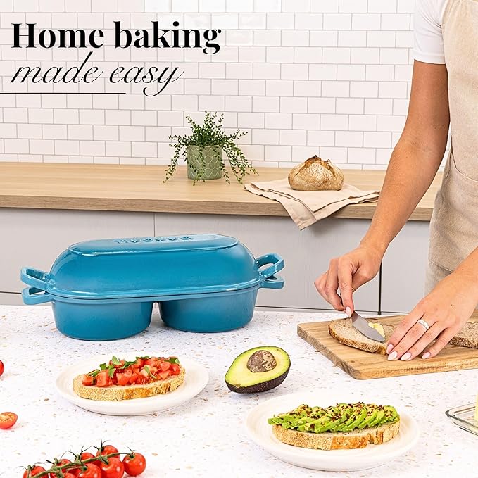 Dutch Oven For Sourdough Bread Baking – Enamelled Cast Iron Bread Loaf Pot – 500°F Oven Safe Non Stick Bread Pot – Double Round Loaf Space, 16.5cm Diameter, Light Blue, – by Nuovva