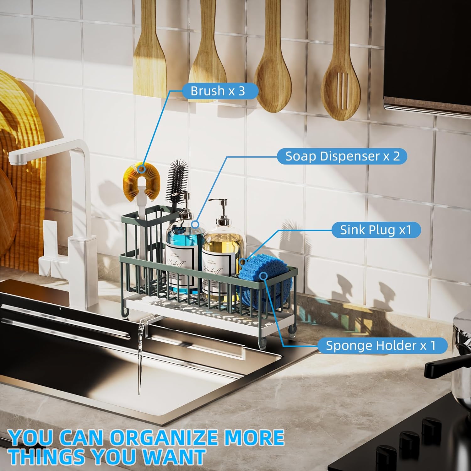 - 【LENGTH UPGRADE LONGER VERSION】Moforoco Lengthen sponge holder has increased the length by 1.37 inches compared to the regular 9.25-inch length on the market, and the total length is 10.62 inches. It means you can accommodate 2 * soap dispenser bottles, 4* brushes, and a sponge, making your storage space easier, accommodating more of your items and saying goodbye to clutter.