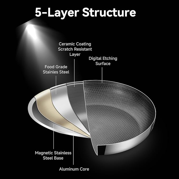 - 【5-LAYER STUCTURE】The large skillet is made of Precision Digital Etching Surface, Ceramic Coating, Food Grade Stainless Steel, Aluminum Core, and Magnetic Stainless Steel Base, saving energy more than 25%, and ensuring fast and even heat conduction, shortening cooking time, making frying steak and cooking more professional.