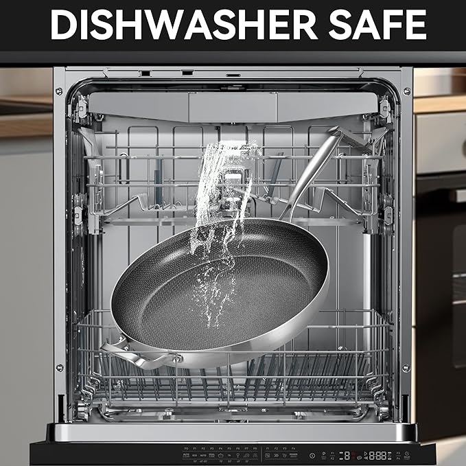 - 【EASY TO MAINTAIN】Thanks to its non-stick hybrid surface, cleaning our frying pan is effortless. Dishwasher safe, the long-lasting non-stick surface can usually be cleaned with just a simple rinse with warm water and a soft brush.