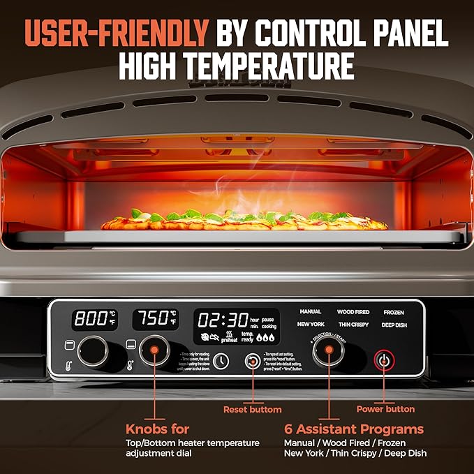 - 【Versatile & Smart Customization】Our indoor pizza cooker boasts 6 preset cooking programs: Manual, Wood Fired, Frozen, New York, Thin Crispy, and Deep Dish. Whether you're a novice or a pizza-making expert, you can also tailor your personal taste pizza—plus, it’s versatile enough to bake bread, cakes, pies, baguettes, and even chicken wings