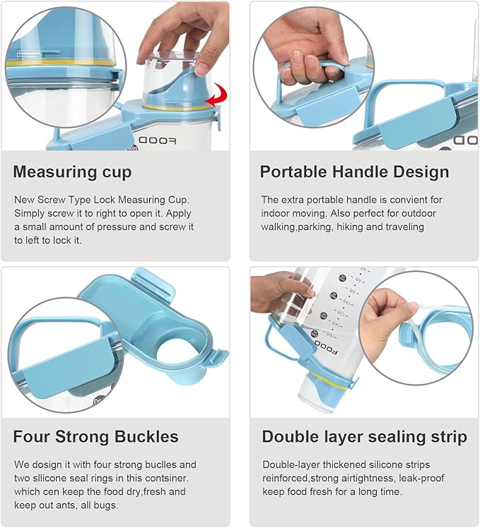- Upgraded and Lmproved Versions:We have optimized and improved the mold the pour spout is large enough to pour out the big dog Food,You can pour out the food easy and fast now. The new upgraded Measuring Cup is also easy to screw on the spout now.The lid with snaps can also be easily closed on the barrel body.