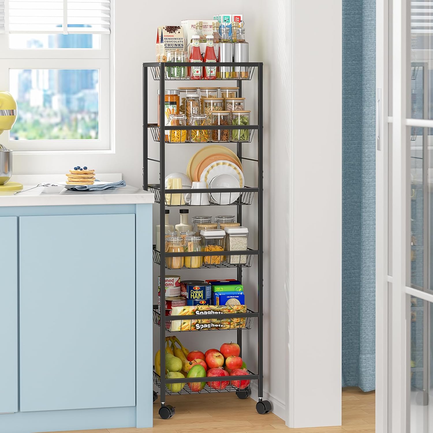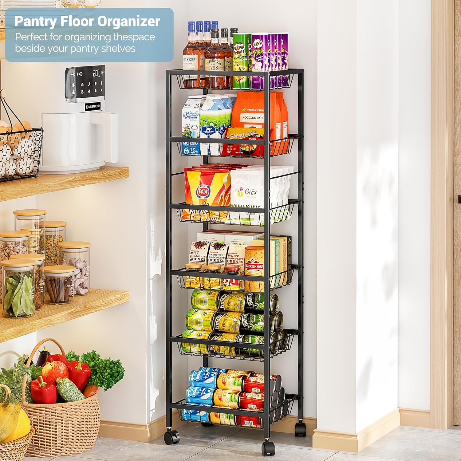 - š[Super capacity]:Each Basket size:14.65 x 11.89 x 8.66 in. Looking for More Pantry Space in Your Pantry? Look no further than our all-purpose rolling pantry storage cart. It boasts plenty of room to store products that don't need refrigeration such as fruit, onion, potato, bread, snacks, water bottles, produce, cans, etc.