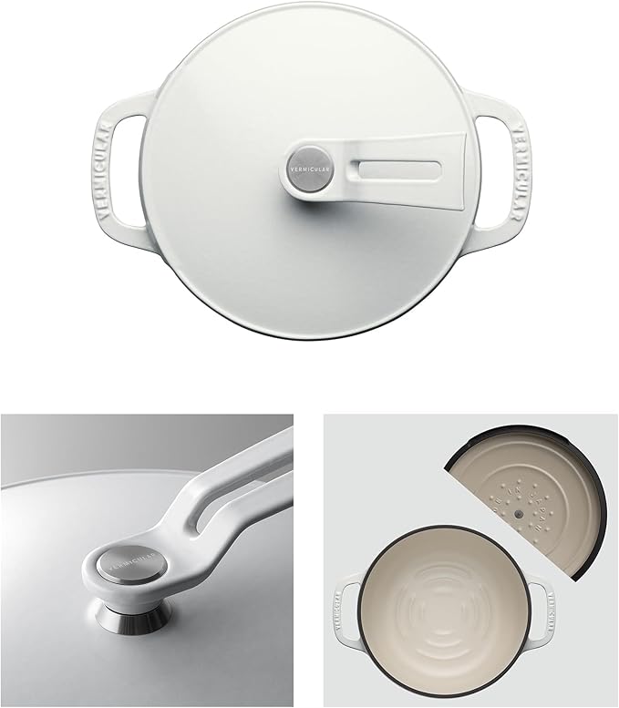 - Instant Evaporation: With Vermicular’s proprietary enamel coating, the pot quickly eliminates surface moisture, making the pot ideal for fast cooking methods like searing, stir-frying, and steam-roasting.