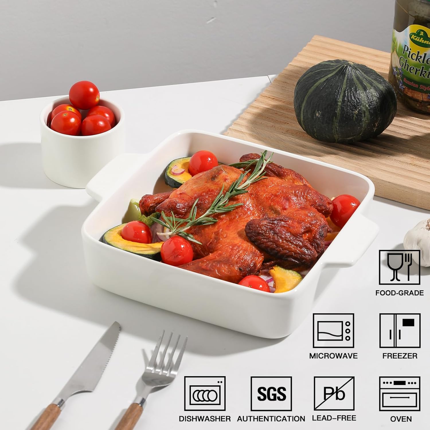 Sweejar Ceramic Baking Dish, 8 x 8 Cake Baking Pan for Brownie, Porcelain Square Bakeware with Double Handle for Casserole, Lasagna, Family Dinner (White)