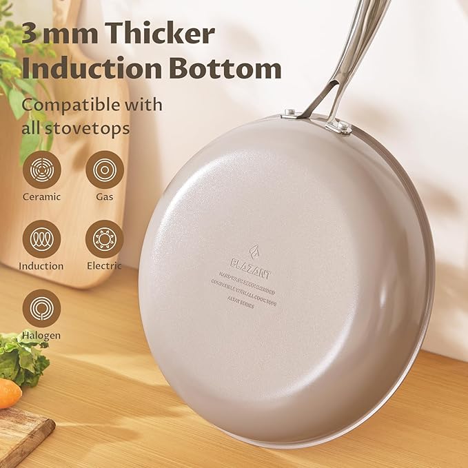 - Improved Compatibility - 80% Boosted: Say goodbye to flickering and error messages common with dotted bases. Our seamless base of non stick frying pans deliver a stable connection on all induction hobs