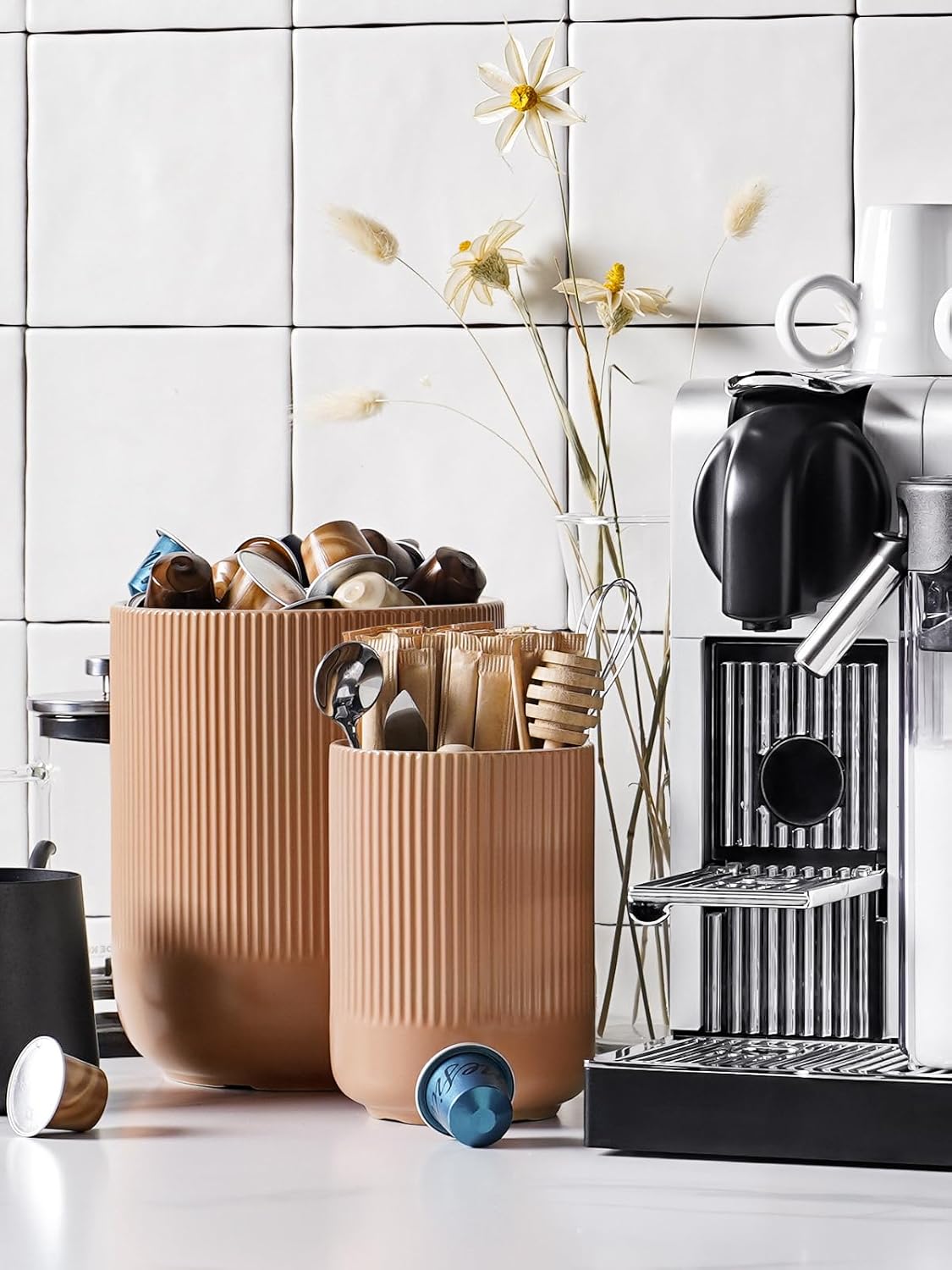 - Multi-Functional Utensil Holder: These kitchen utensil holders do more than just store cooking utensils; They also double as elegant vases, offering a stylish home for hair tools like combs, and can seamlessly house coffee pods and stirrers on your bar countertop; Their versatility knows no bounds
