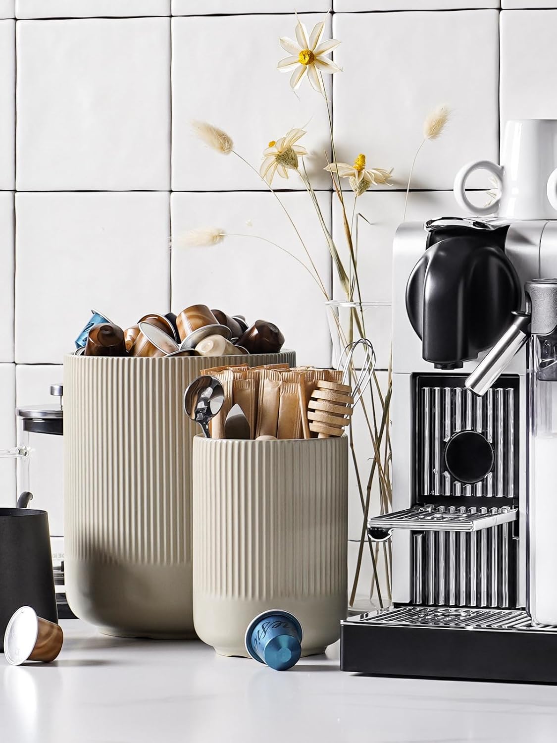 - Multi-Functional Utensil Holder: These kitchen utensil holders do more than just store cooking utensils; They also double as elegant vases, offering a stylish home for hair tools like combs, and can seamlessly house coffee pods and stirrers on your bar countertop; Their versatility knows no bounds