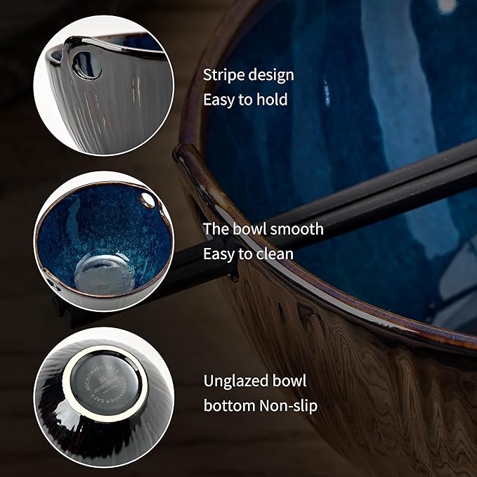 - 【 Unique Ramen Bowl set】are made of high quality porcelain, with special Reactive glaze, the process of refining by no artificial intervention, the glaze itself forms the most pure natural beautiful color and patterns, making each bowl is special one and unique.