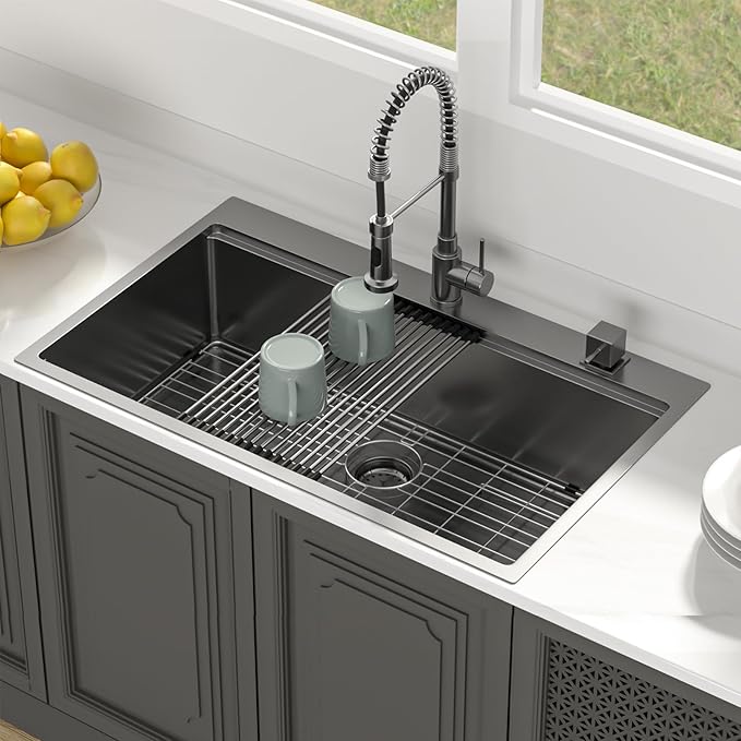 - Humanized Design - This 36 inch black drop in kitchen sink is ultra quiet with thicker rubber pads. which absorb sound from the source. X-shape flow line to avoid clogging. 10 Inch extra deep kitchen sink allows you to soak and clean large cookware and bakeware. Easy to clean corners make for a modern aesthetic and easier cleaning