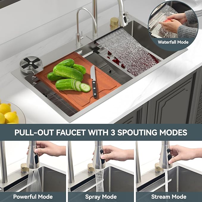 - Multifunctional Waterfall Kitchen Sink - This 33 waterfall kitchen sink has two tracks to provide you with more space to use. You can slide the built-in fittings to make this kitchen sink a makeshift workspace, a multi-functional sink for you to improve kitchen efficiency. 360 Degree Pull Out Swivel Nozzle Kitchen Tap offers 3 spout settings (powerful, spray, stream), with a choice of different water flow patterns to suit your needs. The smart kitchen sink 's addition is the glass rinser, which is a glass washer with a powerful stream of water that thoroughly rinses residue from cups in seconds