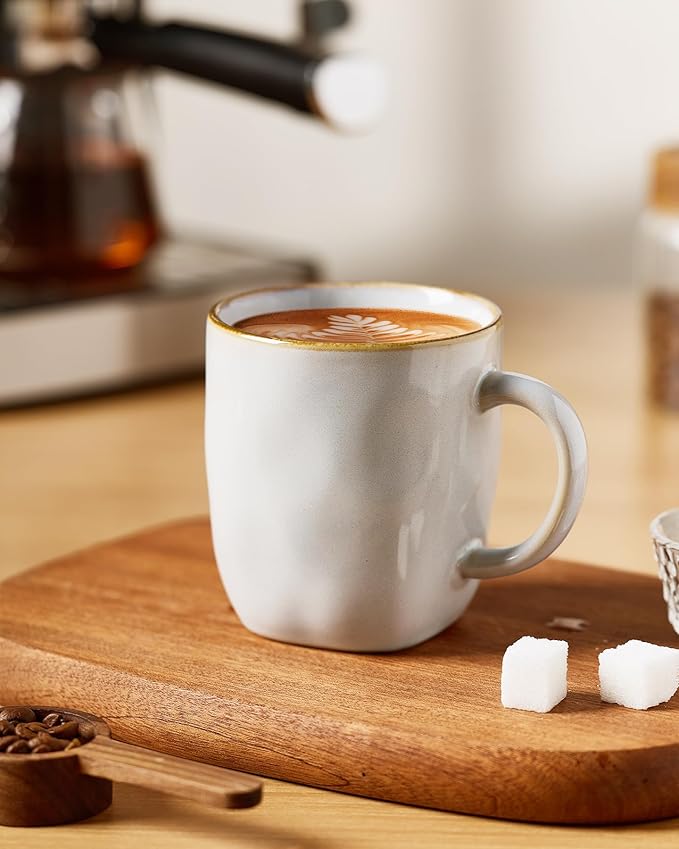 famiware Coffee Mugs Set of 6, Ocean Square 13oz Coffee Cup Set with Handle for Cocoa, Milk, Hot Chocolate, Tea, Water, Stoneware Cups for Kitchen, Microwave and Dishwasher Safe, Cappuccino White