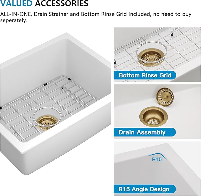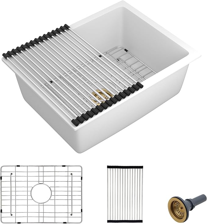 - Package/Fulorni Service ––Complete package includes a 22 inch single bowl granite composite undermount bar prep sink, a roll up drying rack, a bottom rinse grid, a gold drain assembly with cover, etc. If any quality issue about the 22" white bar sink, please reach out to us, Fulorni service team is always ready to help you.