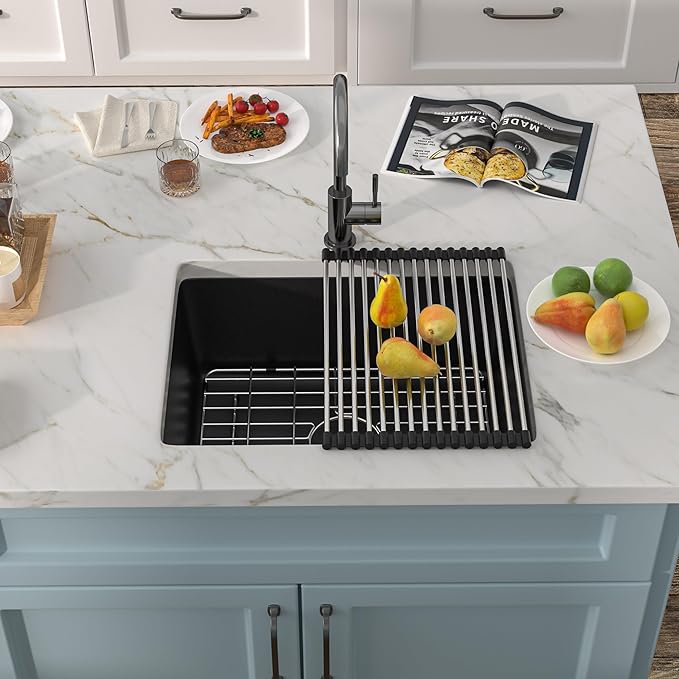 - Package/Fulorni Service ––Complete package includes a 22 inch single bowl granite composite undermount bar prep sink, a roll up drying rack, a bottom rinse grid, a gold drain assembly with cover, etc. If any quality issue about the 22" black bar sink, please reach out to us, Fulorni service team is always ready to help you.