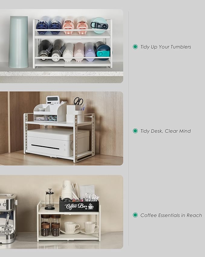 - 【Multi-Purpose Storage Rack】 This versatile countertop organizer is ideal for kitchens, bathrooms, cabinets, pantries, and utility rooms—store dishes, cans, spices, or snacks effortlessly. It’s also perfect for desktops in the living room or home office, organizing books, collectibles, and more. Wherever it’s placed, this rack helps save space and keeps everything neat and beautifully organized.