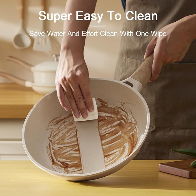 - 【Effortless Cleaning – No Sticking, No Scrubbing】Our ceramic cookware cleans up in seconds—simply rinse or wipe with a sponge. Hand wash is recommended to maintain coating longevity.