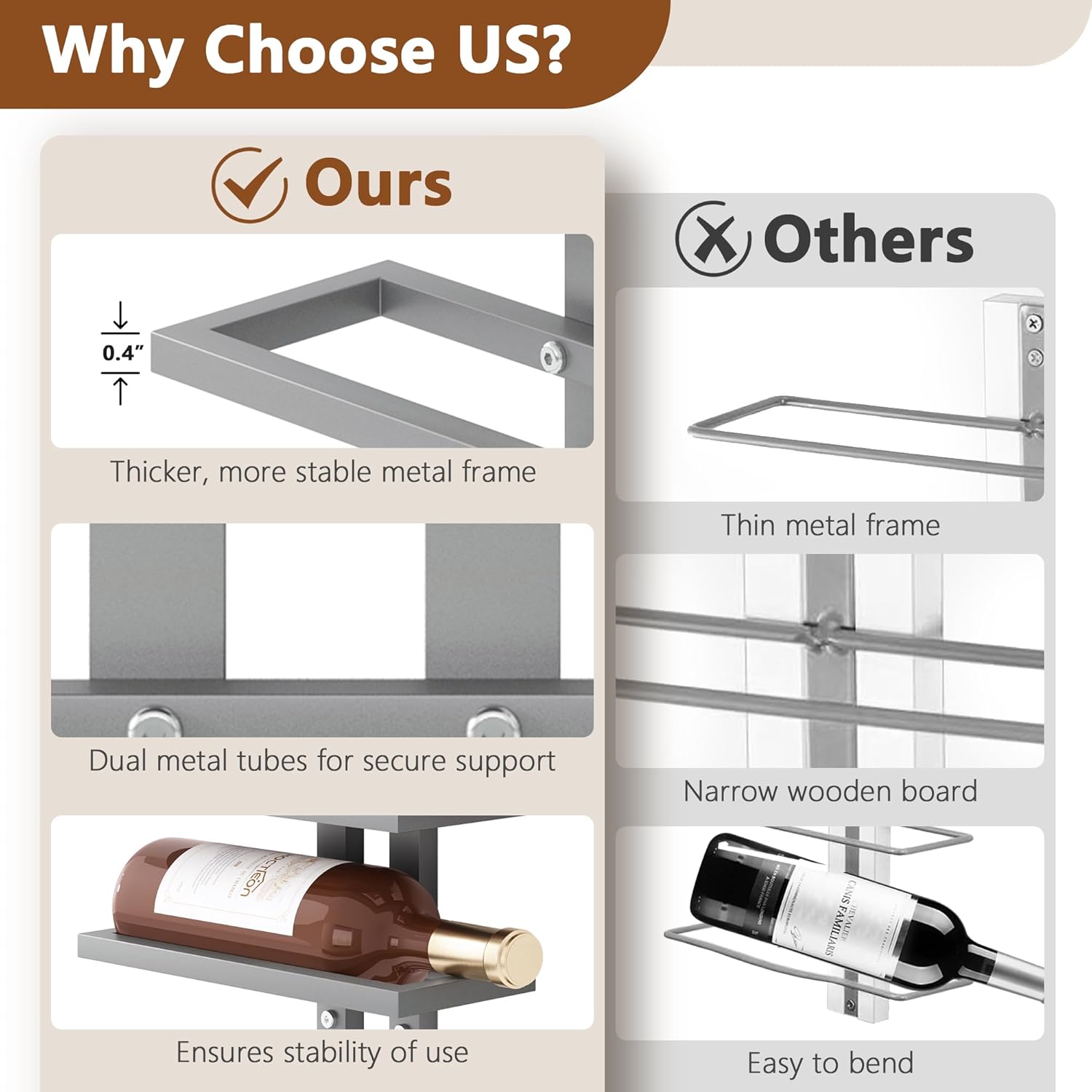 - ăStylish and Modernă The combination of storage, size, and aesthetics, this wall-mounted wine rack showcases bottles of different categories, heights, and depths, adding a sleek, modern element to any commercial or residential collection.