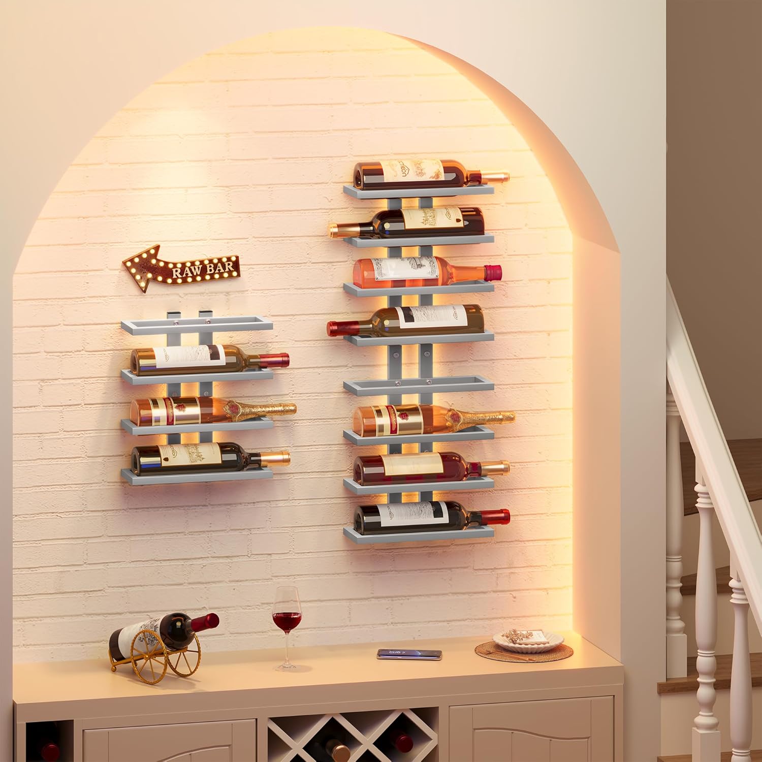 - ăDecor & Save SpaceăEach wine rack can hold up to 8 bottles of wine. This wall-mounted wine rack has a simple and stylish design and can be placed on any wall to save space and make it easy to display and reach. It can also be placed on the wall next to the sink or bathroom to store and organize towels, a multi-purpose.