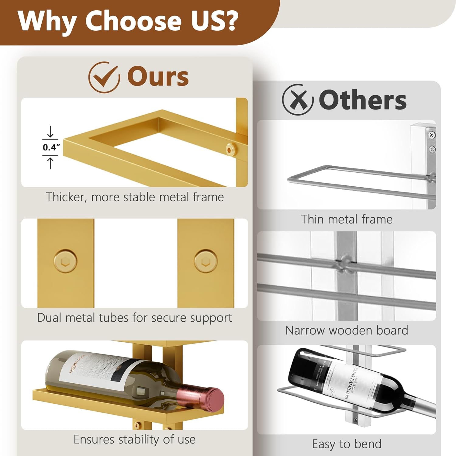 - ăStylish and Modernă The combination of storage, size, and aesthetics, this wall-mounted wine rack showcases bottles of different categories, heights, and depths, adding a sleek, modern element to any commercial or residential collection.
