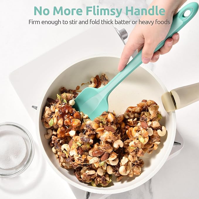 - [Extra-Long, Firm and Nonslip Handle] No more burned fingers or struggling with short utensils! Our extra-long 14.17inch/36cm silicone spatula spoon gives you the full reach into deep pots and pans, keeping your hands safely away from steam, boiling water, or hot oil splatters. Unlike flimsy spatulas, our reinforced silicone spoon won't bend when mashing potatoes or flipping meats. The textured non-slip grip stays secure in hand even when wet or greasy, keeping you in full control while cooking.