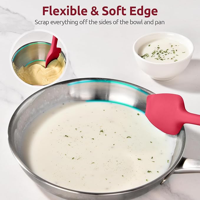 - [Spoon Shape & Flexible Edge for Effortless Scooping and Scraping] Say goodbye to wasted ingredients! This silicone spoonula features a flexible yet sturdy edge that perfectly conforms to container curves-whether it's a mixing bowl, saucepan, frying pan, or stand mixer, effortlessly scraping every last bit of batter, dough or sauce. The shallow spoon-shaped head excels at scooping, stirring and serving. Its slightly curved and thin design allows it to glide smoothly under delicate foods.