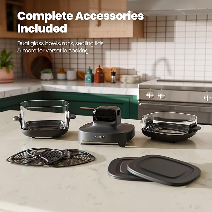 Kismile 5-in-1 Portable Glass Air Fryer, 2.6QT & 4.7QT Dual Glass Containers with Lids, 85% Less Oil, Compact Smart Air Fryer Oven for Deep Roast, Crisp, Keep Warm – Freezer & Dishwasher Safe