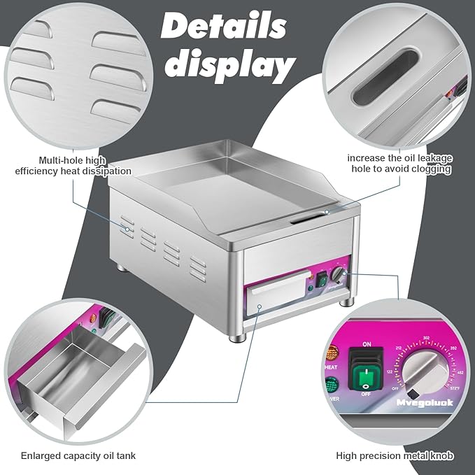 - Thoughtful design:large commercial electric grill upgraded with a large oil leakage hole, which allows oil and food debris to be better organized into the same built-in drawer type large-capacity oil compartment to clean up more convenient, surrounded by 2.36-inch height of the fence using seamless precision welding, to prevent spattering of oil at the same time will not leak oil beautiful and easy to clean!