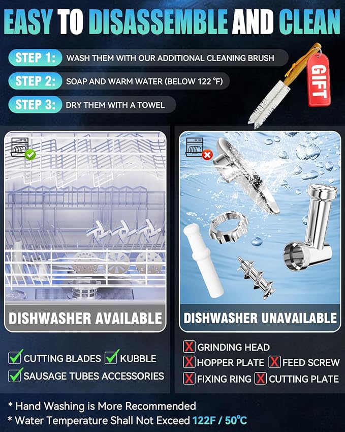 - 【Easy to Clean - Free Brush Included】The meat grinder has easy-to-disassemble parts. with stainless steel blades and plates dishwasher-safe. (note: other aluminum parts and food pusher should be hand-washed to prevent oxidation). with a cleaning brush included for easy cleaning.