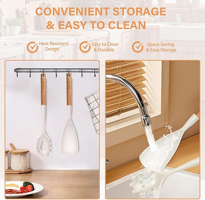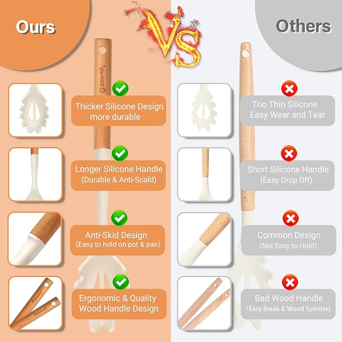 - 🏆【Easy to Clean & Attention】Our silicone pasta fork and spatula spoon have smooth surface which is easy to clean. Attention: This product comes with a natural wood handle. Please do not soak it in water for a long time or use a dishwasher. Avoid using a hard or abrasive dishwashing brush to clean the wooden handle. It is recommended to clean it by hand with clean water or gently wipe it with a soft cloth. Make sure the wooden handle is completely dry before storage.