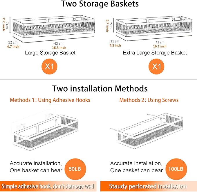 - 【MULTI-PURPOSE&MULTIFUNCTIONAL】5 Hanging Storage Baskets Organizer Set for Sufficient Bathroom Kitchen Storage Space, The bathroom&Kitchen organizer comes with 5 pieces for different uses, including 2 Hanging Storage Baskets, 1 soap holder,1 Tissue holder ,1 utensil holder and 2 adhesives. The perfect solution for organizing a multitude of every items indoor or outdoor. The cabinet organizer hanging baskets wall mount is Ideal for organizing and storing spice bottles, pantry items, snacks, toiletries, tools, craft supplies,etc. And this metal bin basket free up enough space for your homes, kitchen, living room, bathroom, camper, farmhouse, apartments, college dorm rooms, etc.