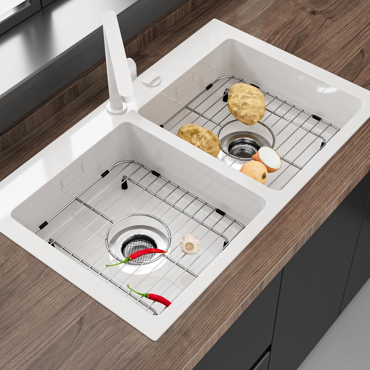 - Package: 2 pack sink rack for bottom of kitchen sink and 2 pack sink strainers. If you are not satisfied with this premium sink grate or have any questions, please feel free to contact us at any time. We will promptly resolve your issues for you.