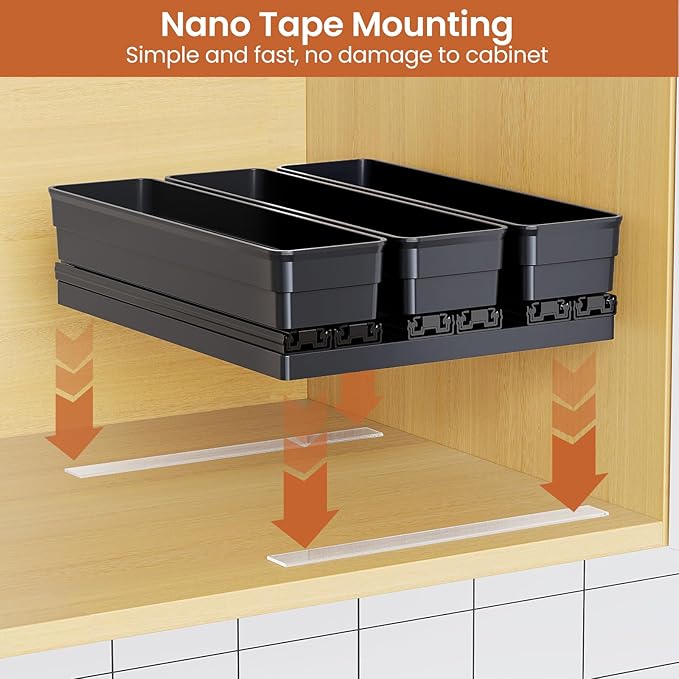 - 【Simple Installation】Just stick nano tape to the base of the slide out spice rack organizers and fix it to the cabinet. It is simple, no drilling, does not damage the cabinet.