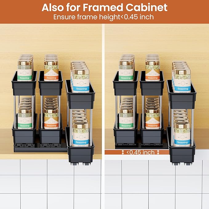 - 【For Framed Cabinet】Tired of vertical spice rack that jam against your cabinet’s with lip? Mystozer pull out spice rack for cabinet slides perfectly over the lip of cabinets <0.45inch in height. Won’t scrape or damage delicate cabinet finishes.