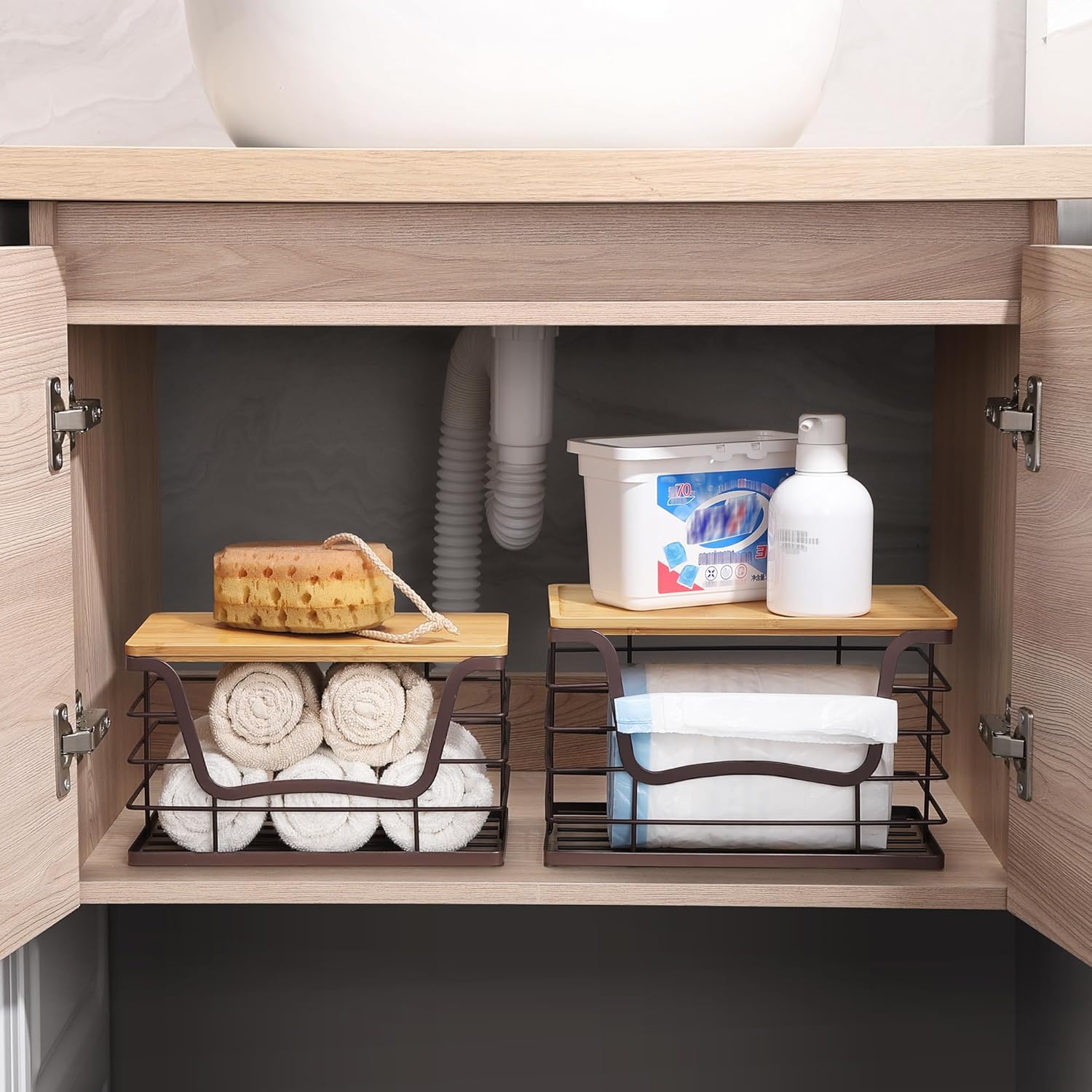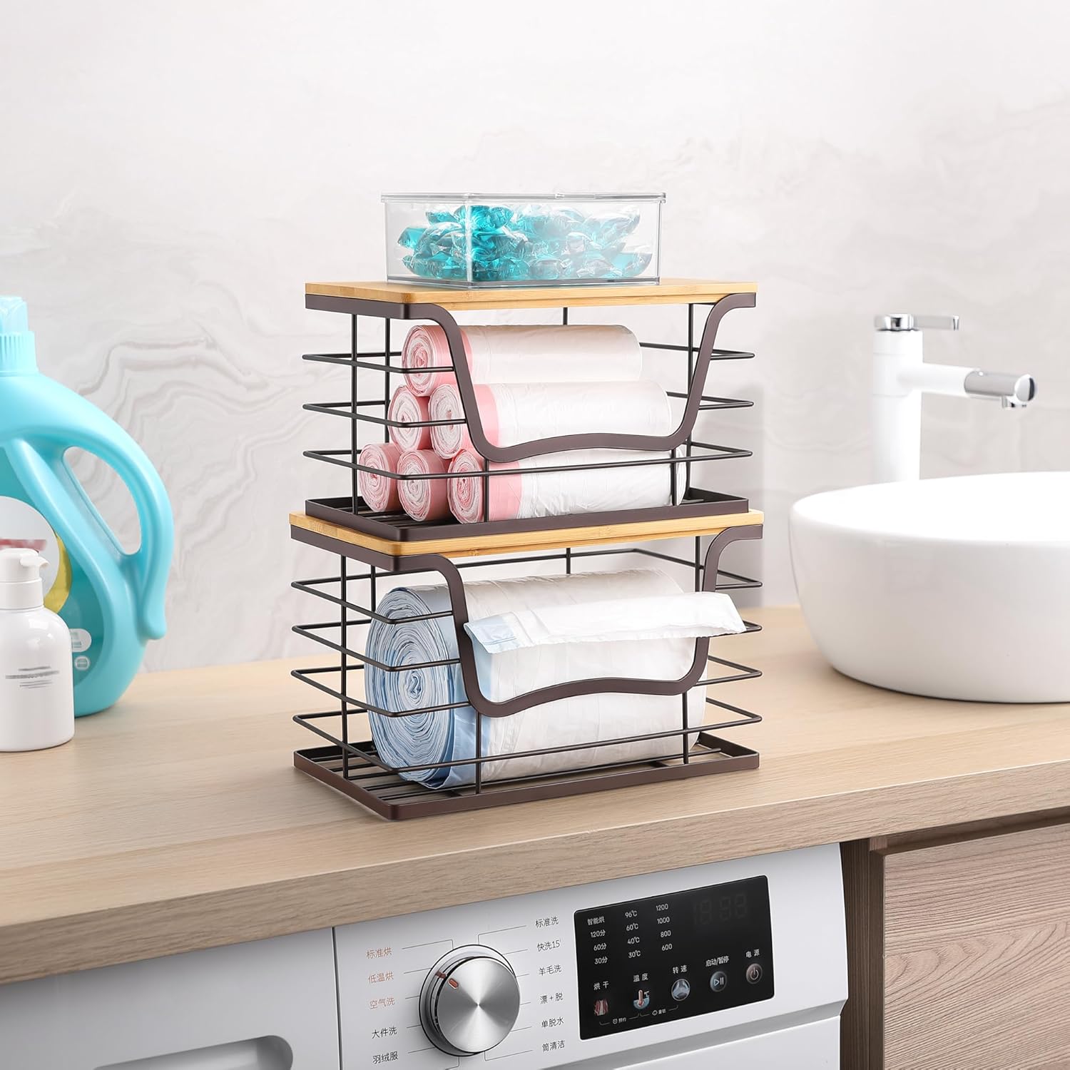 Trash Bag Dispenser Holder for Kitchen 2 Pack Brown Finish Garbage Bag Organizer Wall Mount Stackable Bin with Bamboo Lid for Countertop, Under Sink, Laundry Room