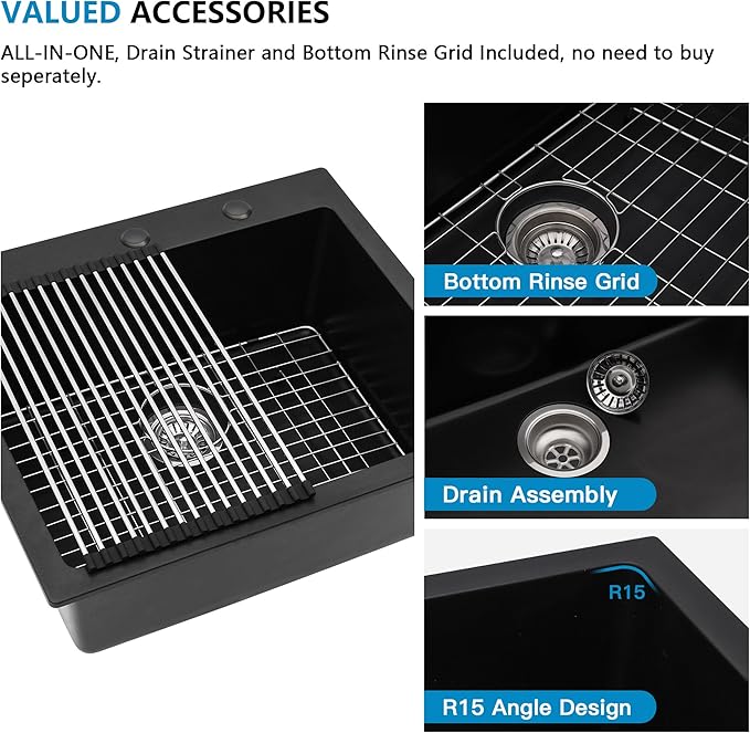 - 〓 Sink Set/Installation - Complete package includes a 25 inch topmount black granite composite kitchen sink, a roll up drying rack, a bottom rinse grid, a drain assembly and more.|Cutout Size: 24.2"(width) x 21.2"(depth)|Minimum Cabinet Size: 28 inch. Easy to install topmount granite sink drop in. | If any quality issue, please reach out to us, Fulorni Service team is always ready to help you.