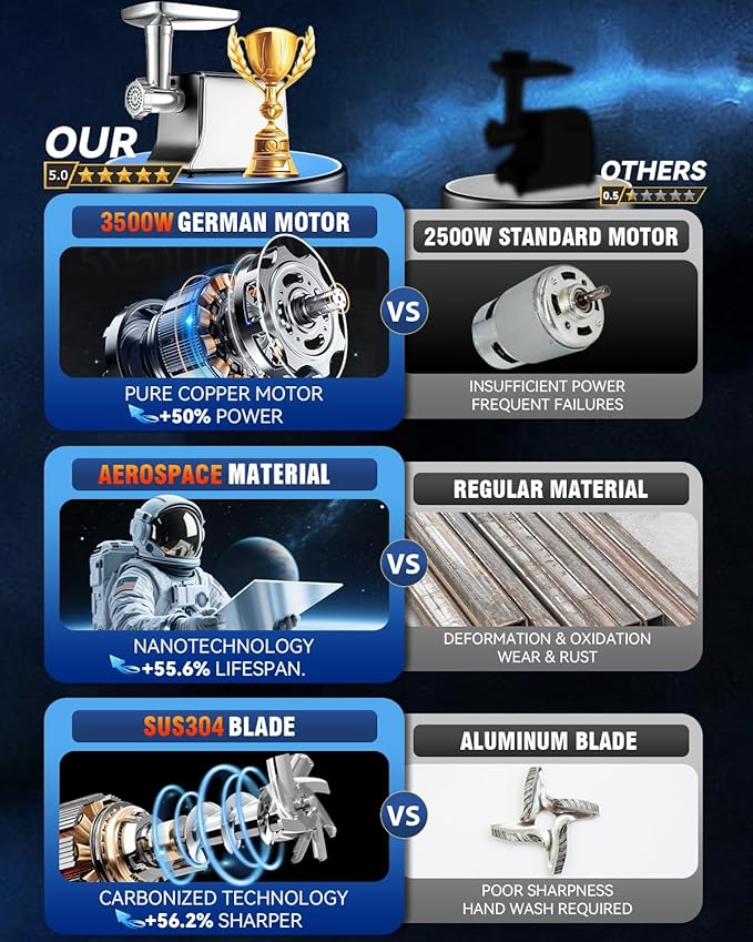 - 【Industry Top 1 - 3500W German Motor】The grinder for kitchen features a German pure copper motor with an efficient magnetic circuit design, reaching speeds of up to 5000 RPM. It delivers double the power, cutting meat in just 3 seconds.