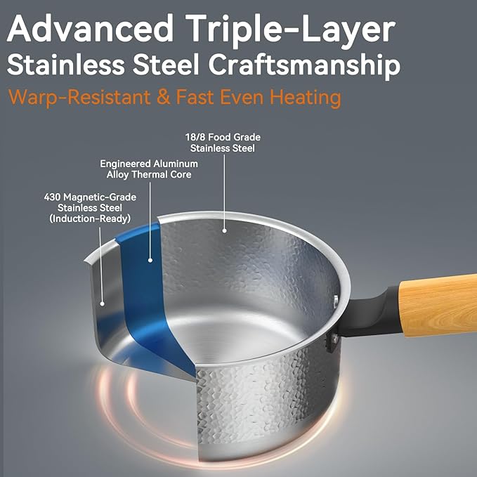- 【Superior 3-Ply Stainless Steel Construction】Engineered for performance and longevity, our sauce pan features professional 3-ply stainless steel. This warp-resistant build ensures fast, even heat distribution across the entire base, eliminating hot spots for perfect cooking results every time. Built sturdy and durable to withstand daily use without deforming