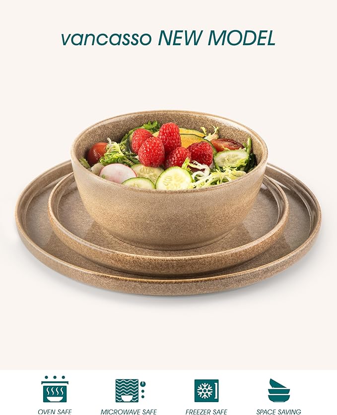 vancasso ANYA 24 Pieces Plates and Bowls Set, Caramel Dinnerware Sets, Reactive Glaze Dishes Set for 8, Ceramic Dishware Sets Kitchen Dinner Set, Microwave & Dishwasher Safe